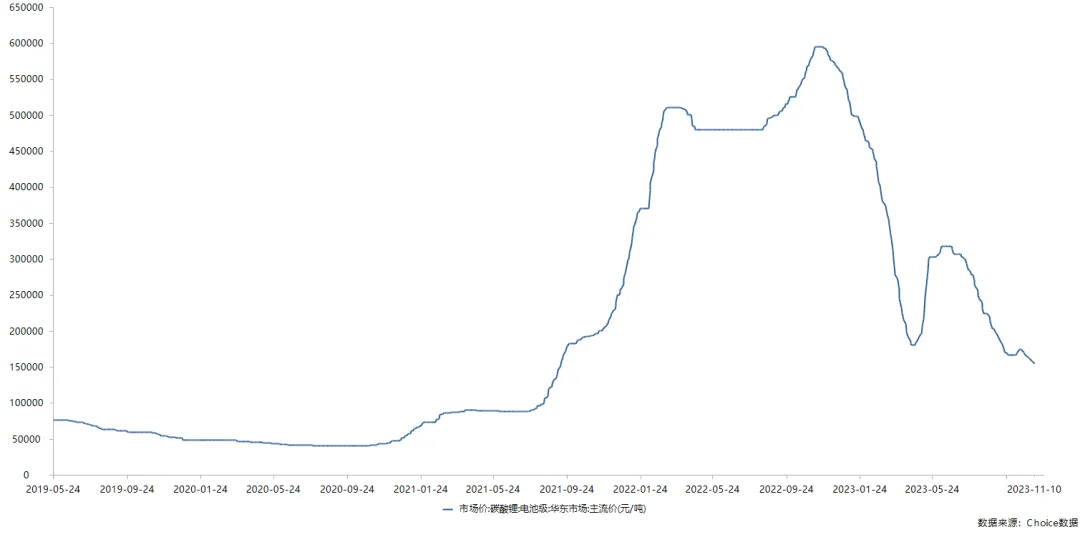 他举例, 22 年电池价格飞涨,原料碳酸锂一度从 5 万 / 吨涨到 60 万 / 吨,再加上国家补贴退坡、新能源车当时也还没形成规模化优势,所以当时无论是比亚迪还是各位友商大家都涨价了。