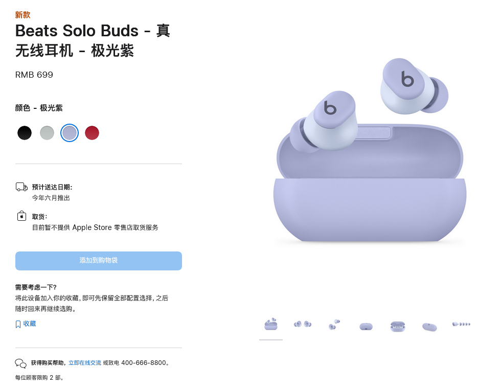 Beats Solo Buds 耳机海外预购日期为 6 月 18 日星期二,发售日期为 6 月 20 日星期四,有哑光黑、风云灰、极光紫和晶透红四种颜色,售价为 699 元。