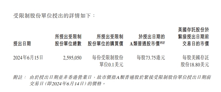 受限制股份单位授出将不会导致于直至有关授出日期(包括该日)的12个月期间内已授予及将授予各个别承授人的购股权及奖励合计超过已发行股份的1%。受限制股份单位授出将不会导致于直至有关授出日期(包括该日)的12个月期间内已授予及将授予各关连实体参与者或服务提供商的购股权及奖励合计超过已发行股份的0.1%。