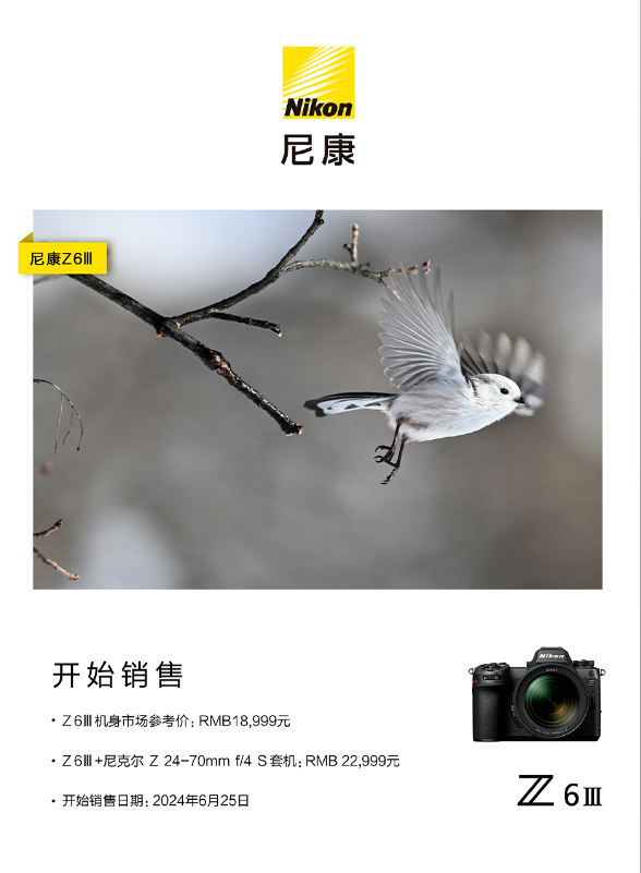 快科技6月18日消息,备受期待的尼康Z6 III终于发布了,单机身18999元,尼克尔Z 24-70mm f/4 S套机22999元,将于6月25日开售。