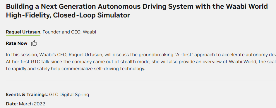 值得一提的是,在Waabi创立不到1年的时候,Urtasun就在英伟达2022年3月GTC Digital Spring会议上分享了公司通过AI加速自动驾驶技术开发的方案,并介绍了Waabi World。那时英伟达还未像现在这样“大红大紫”。今年3月,Urtasun参与了英伟达GTC 24。