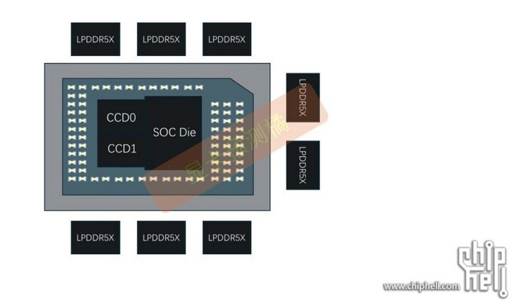 如图,传闻 Strix Halo 独特小芯片设计很新显卡布局,核心旁边一圈是 LPDDR5X 内存,有8颗,合计能够做到128GB。
