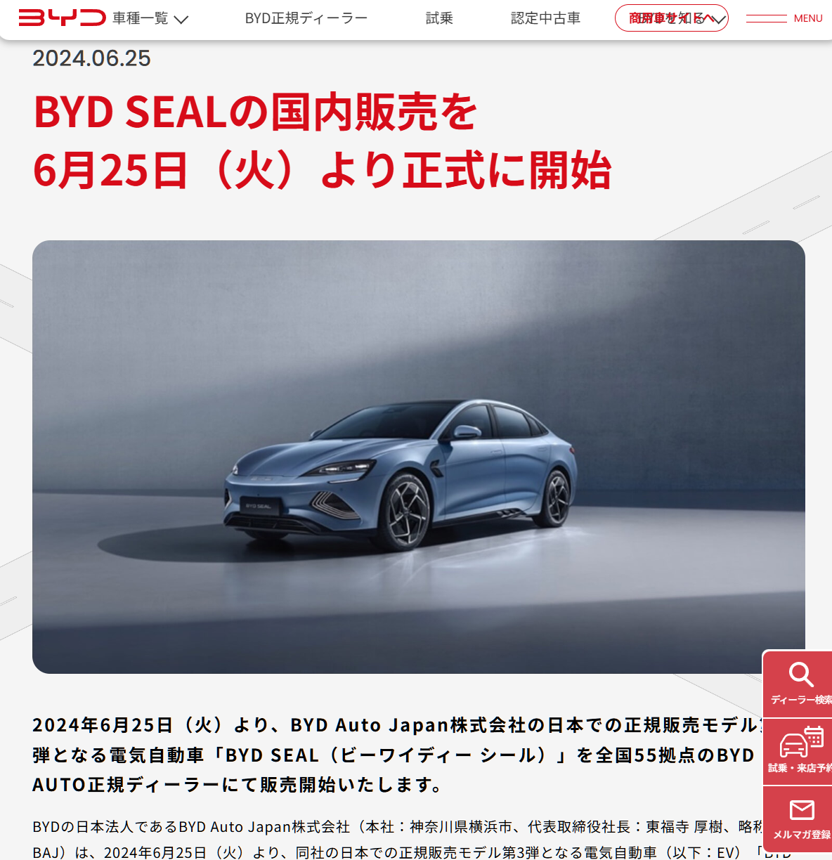 6 月 26 日消息,比亚迪汽车宣布,当地时间 6 月 25 日起,旗下电动轿车“SEAL(海豹)”将登陆全日本 55 家比亚迪授权经销商,同日起在日本开售。官方表示,前 1000 名下定用户将适用于特别优惠价格。