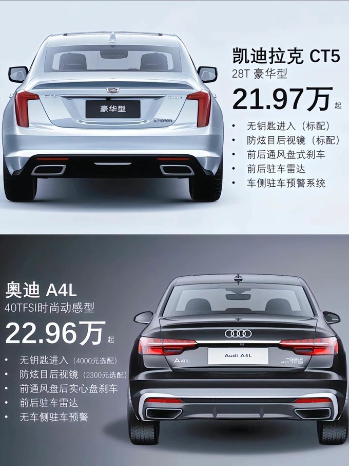 好难选,一样的价格选ct5还是a4??ct5标配矩阵式LED大灯,实在让人喜欢,仪式感拉满,外观内饰也不错。而且部分四儿子店把优惠做到23w全款落地,谁能不心动啊!