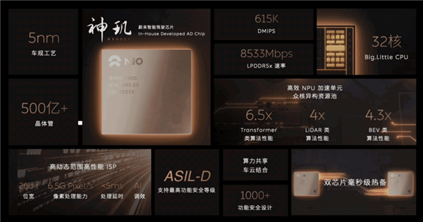 官方信息显示,蔚来神玑NX9031是一款5纳米工艺、拥有超过500亿晶体管的智能驾驶芯片,于2023年9月发布。
