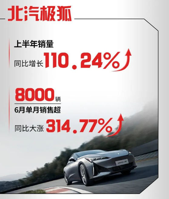 北汽集团分别公布旗下五大品牌极狐汽车、北京汽车、北京奔驰、北京现代和北汽福田的销量。极狐品牌上半年累计销量为1.8万辆,同比增长110.2%;其中6月销量超8000辆,同比上涨314.8%。北京品牌越野车上半年国内销量为1.62万辆,同比增长24.1%。北京奔驰累计产量突破500万辆大关,迈入整车与发动机产量“双500万”新时代。北京现代上半年销量为10万辆。北汽福田上半年累计销量为30.02万辆,其中新能源汽车销售2万辆,同比增长22.44%。
