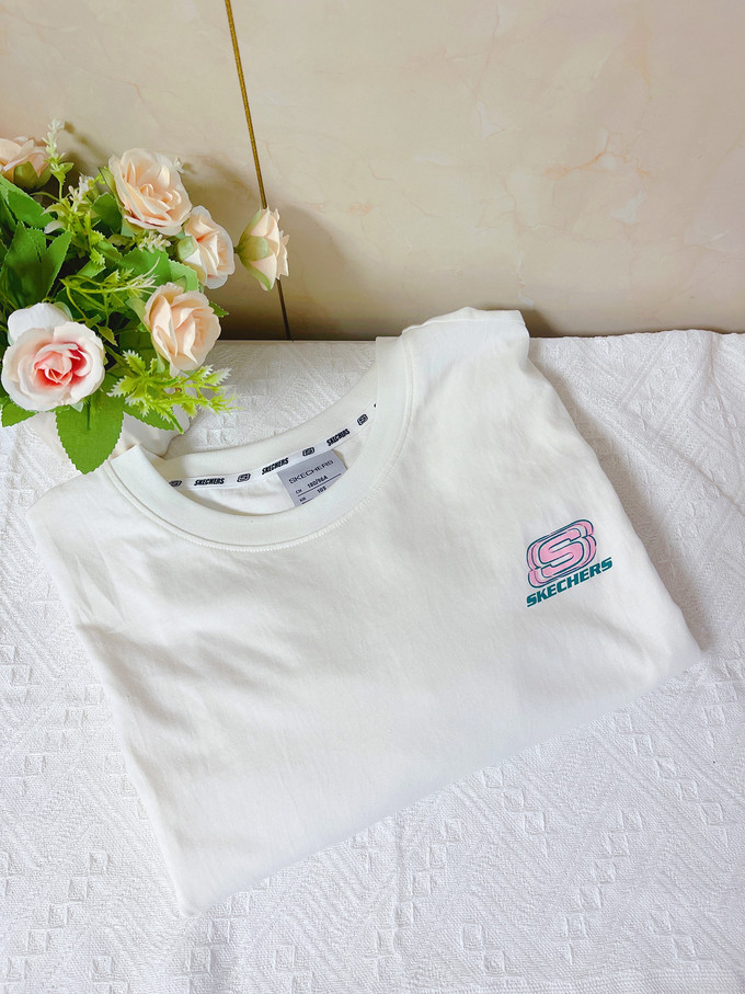🌈购入原因:我是一个非常爱买白T的人,在购入鲨鱼裤、瑜伽裤之后,基础白T的长度就显短了,在选购长白T过程中,发现了斯凯奇这款T,长度非常够,款式够简洁,100%全棉,就它了。