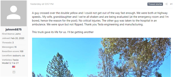 这位劫后余生的用户表示,他们的车辆被撞旋转了一圈,但没有翻车。他感谢特斯拉的工程和制造团队,认为这辆卡车为了他们牺牲了。因此,他决定再次购买一辆Cybertruck。