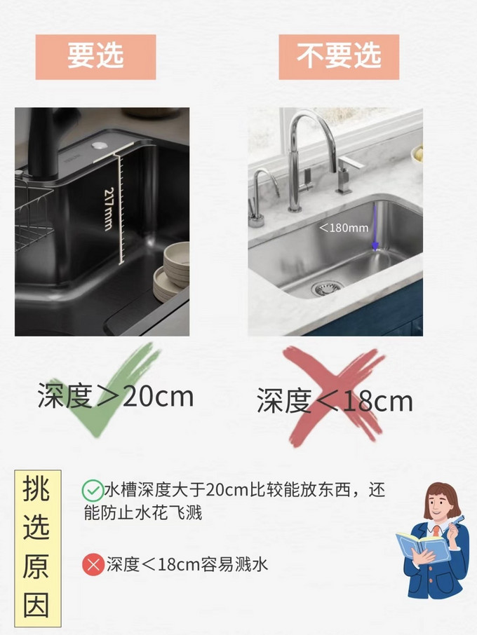 水槽深度<18cm容易溅水,也放不下多少碗筷餐具
