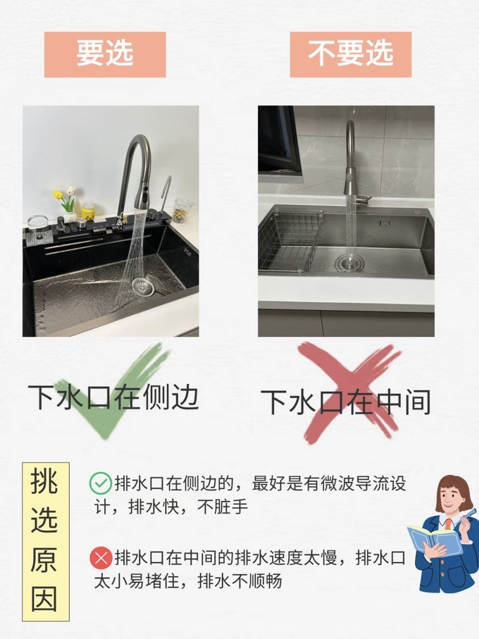 3⃣️选下水管大的,不选下水管小的大的下水管排水快,也能直接带走台上的垃圾,蓄的厨余垃圾多,可以做完一顿饭再清洁